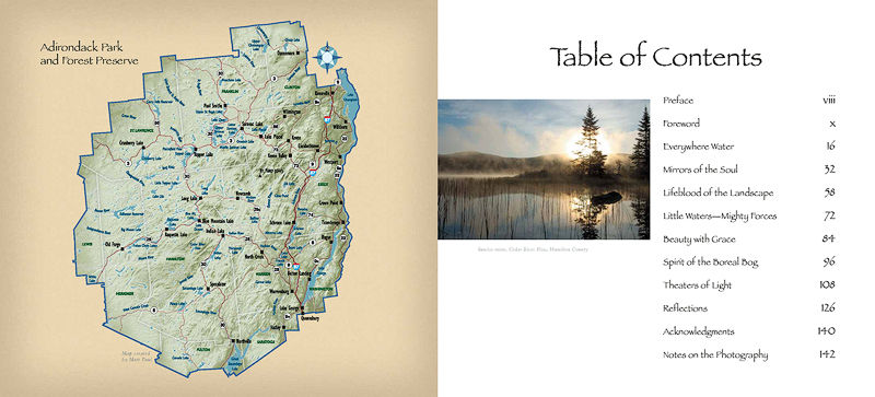 Adirondack Waters: Spirit of the Mountains is a celebration of the Adirondacks’ beautiful lakes and ponds, rivers and streams, brooks and creeks, wetlands and waterfalls. It's the most comprehensive and spectacular collection of Adirondack water images ever assembled in print — the culmination of ten years of photographing the region — accompanied with inspired text and quotes from Adirondack literature. Published by North Country Books, Utica, NY (315) 735-4877.